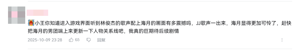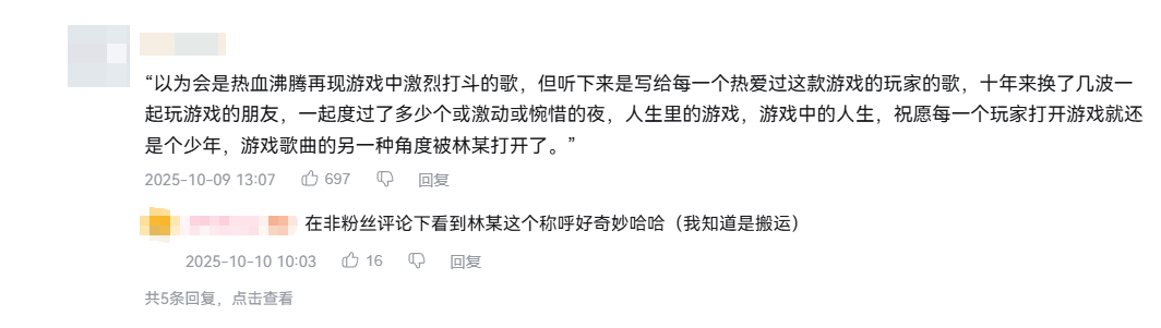 这首歌甚至让《王者荣耀》本身以一种意想不到的方式“歌手出道”——在不少玩家的近期最爱歌手榜单中,《王者荣耀》的名字,与林俊杰并肩出现在了一起。这些调侃,总会让人会心一笑。