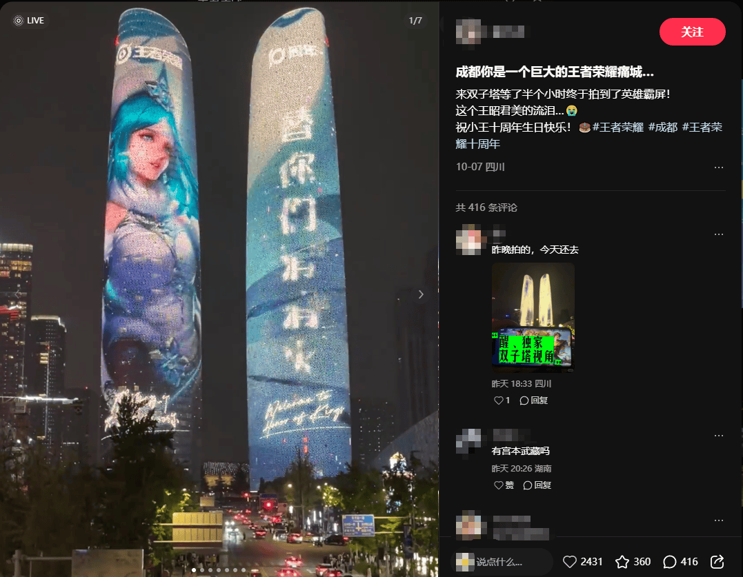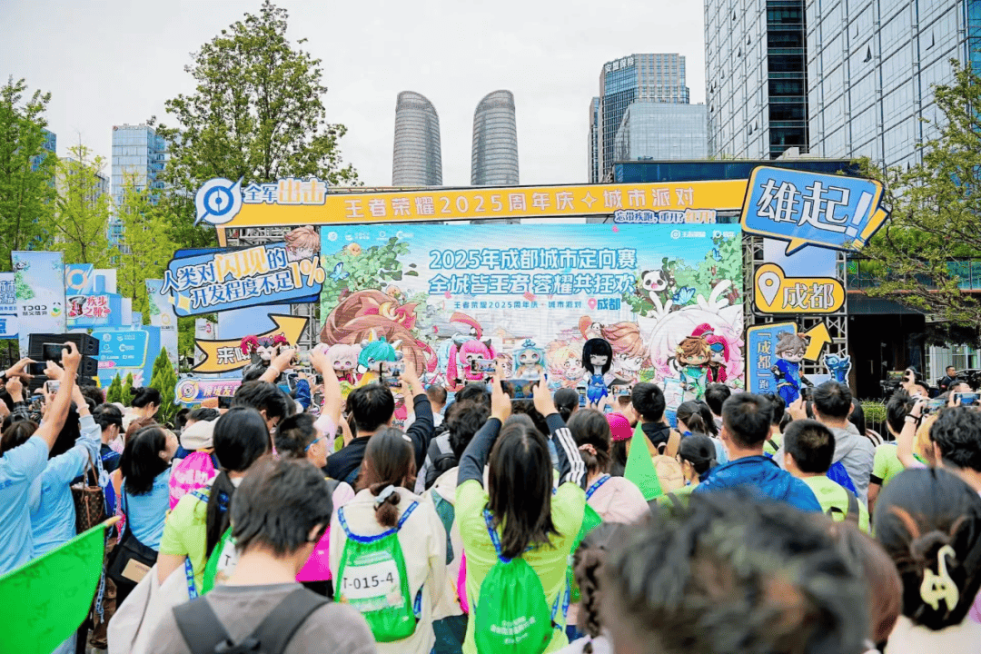 而最近的成都,作为《王者荣耀》10周年的主舞台,也成为了一座“无处不王者”的痛城。9月底,交子大道音乐广场上的“王者荣耀”十周年城市嘉年华启动仪式与国庆相逢。“荣耀派对”氛围,蔓延流淌在交子大道、春熙路、天府广场、东郊记忆、宽窄巷子等成都地标,化作持续整个10月的全城狂欢。