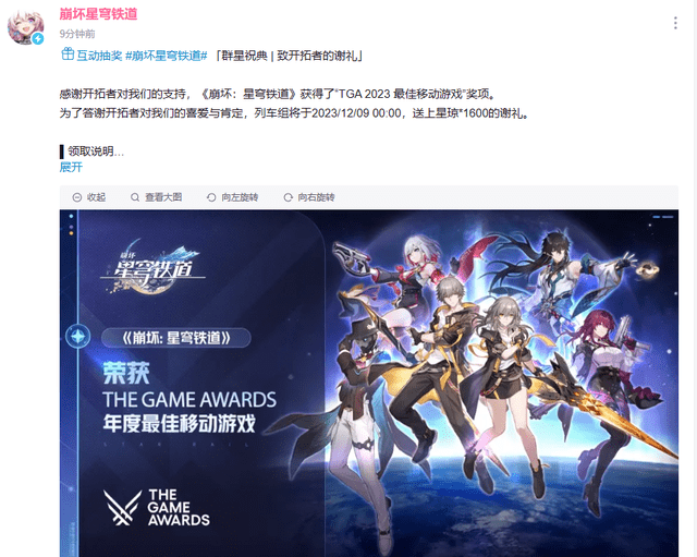 在TGA2023颁奖典礼上,《崩坏:星穹铁道》力压《最终幻想7:永恒危机》、《Hello Kitty岛冒险》、《怪物猎人Now》、《伊始之地》等游戏,拿下“TGA2023年度最佳移动游戏"的奖项。
