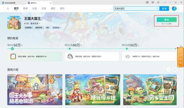 方法一:启动模拟器,在游戏中心搜索“王国大国王”,点击预约,待游戏上线后即可畅玩。
