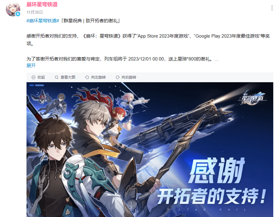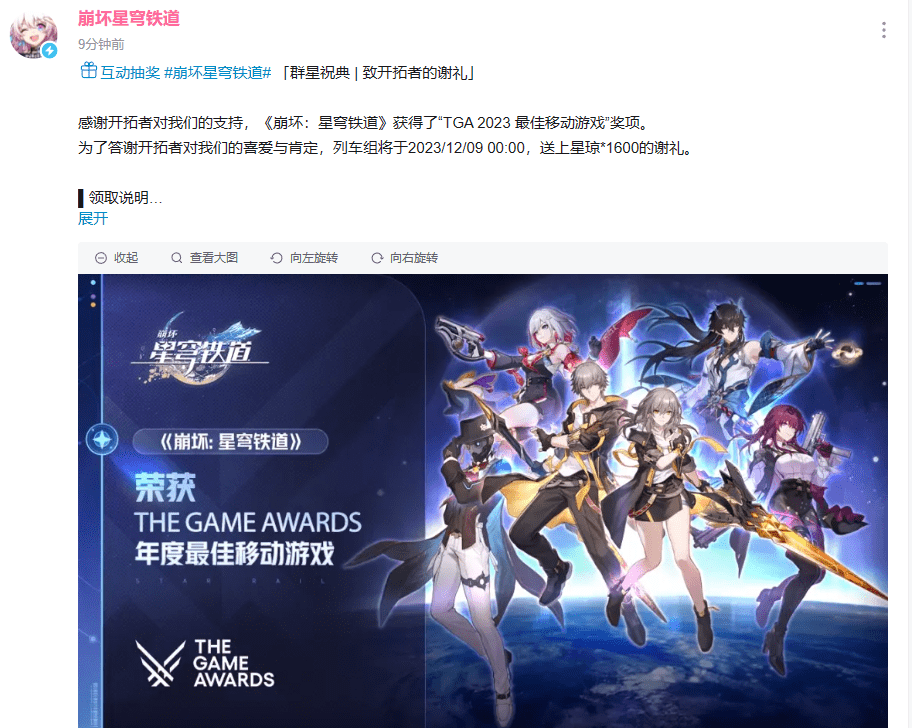 虽说早在11月30日的时候,《崩坏:星穹铁道》就成为了谷歌、苹果的2023年度最佳游戏得主。但大家还是十分关注今年TGA最佳手游的归属,因为这个奖项算得上游戏界的最高荣誉之一,而且现在玩家还能获得1600星琼,相当于可以白嫖一个10连抽,这对于玩家来说,简直就是物资和精神层面的双丰收啊。
