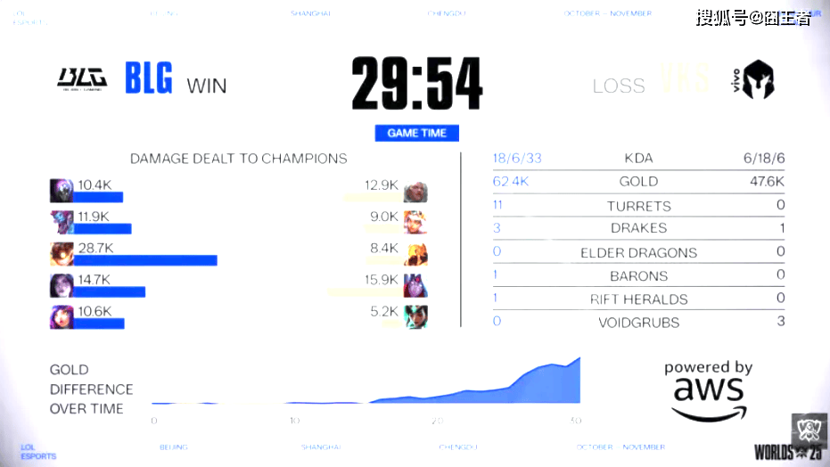 结果第一局比赛,被BLG打成了单方面的碾压局。比赛第4分钟左右,BLG打野配合AD越塔,被安蓓萨丝血反杀;比赛第6分钟左右,VKS下路三人越塔,打出1换2;比赛第25分钟左右,BLG大龙逼团打出1换5;最终比赛第29分54秒,BLG团灭VKS,一波结束比赛。