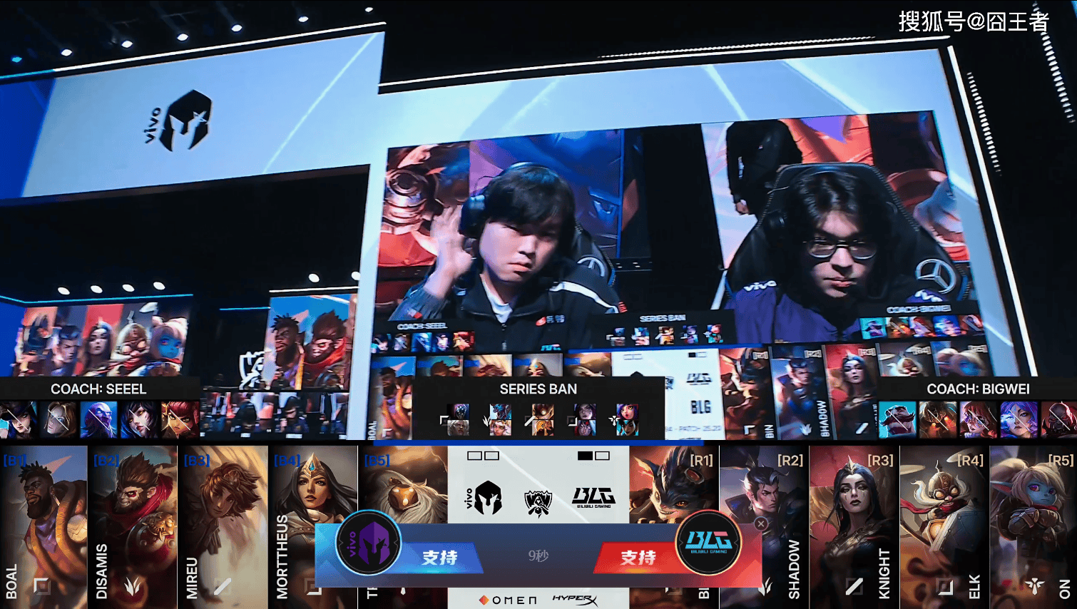 第一局比赛,BLG蓝色方,禁用:赛恩、猴子、阿萝拉、鳄鱼、波比,选用:Bin武器、Shad0w巨魔、Knight炸弹人、Elk卡莎、ON妮蔻;VKS红色方,禁用: 约里克、女警、EZ、发条、芸阿娜,选用:Boal安蓓萨、Disaims奇亚娜、Mireu沙皇、Morttheus韦鲁斯、Trymbi卡尔玛
