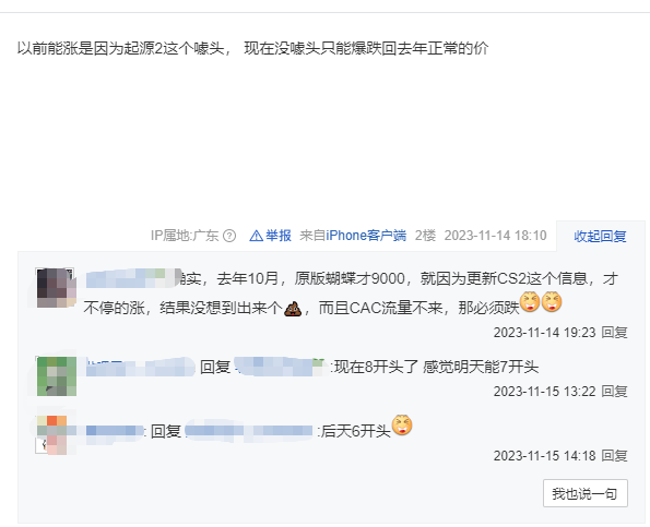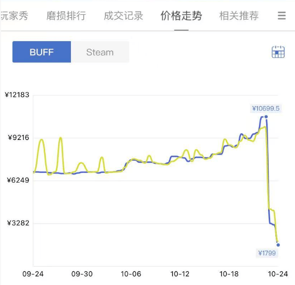 2023年末,《CS2》上线,利好落地引发价格调整,更有传言有机构大力做空,短短几日饰品价格全线跳水。当时的原皮蝴蝶刀从12000元一路跌至8800元。
