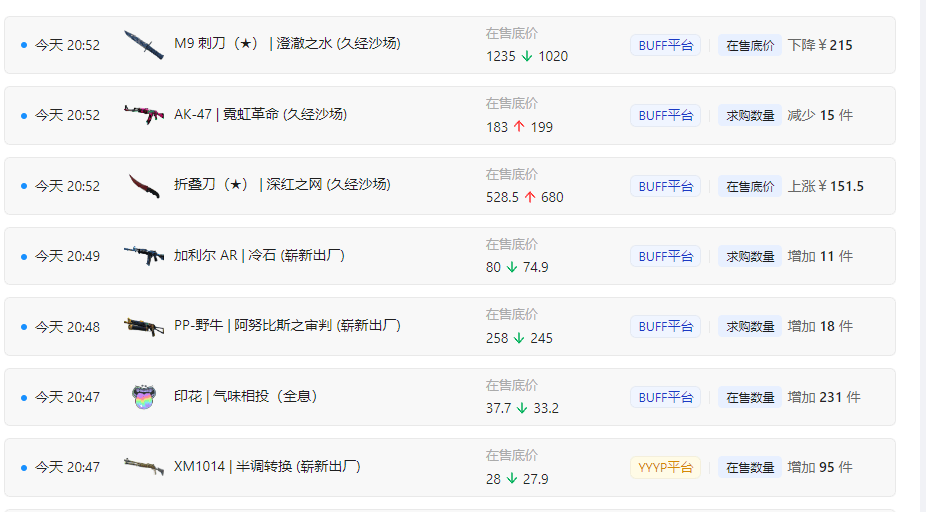 下跌诱因是游戏公司Valve公布《CS2》重大更新,导致高端饰品稀缺性不再——新推出的“以旧换新合同”功能,允许玩家用5件红色皮肤合成金色饰品。