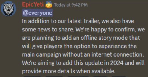 “除了我们最新的预告片,我们还有有些新闻要分享。我们很高兴地确认,我们计划添加一个离线故事模式,让玩家可以选择在没有互联网连接的情况下体验主线剧情。我们的目标是在2024年添加此更新,并在可用时提供更多细节。”