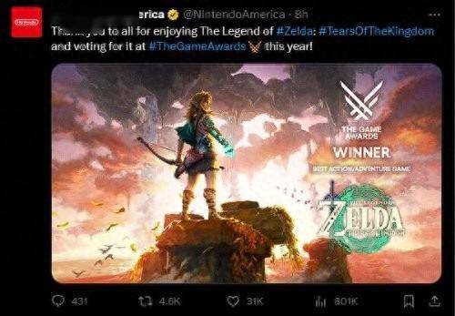 在《塞尔达传说:王国之泪》收获了TGA 2023最佳动作冒险游戏大奖后,美国任天堂发布了《塞尔达传说:王国之泪》TGA获奖纪念贺图。一起来看一下吧。
