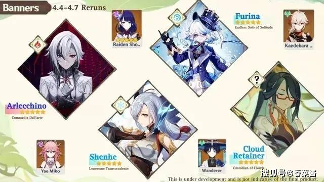4.3卡池是娜维娅+绫华;雷神+宵宫+夏沃蕾。其实这是mhy让稻妻角色团建打榜,打包出售。这个卡池如果放在稻妻版本是非常炸裂的,当然由于枫丹数值膨胀,她们的强度就黯然失色了。