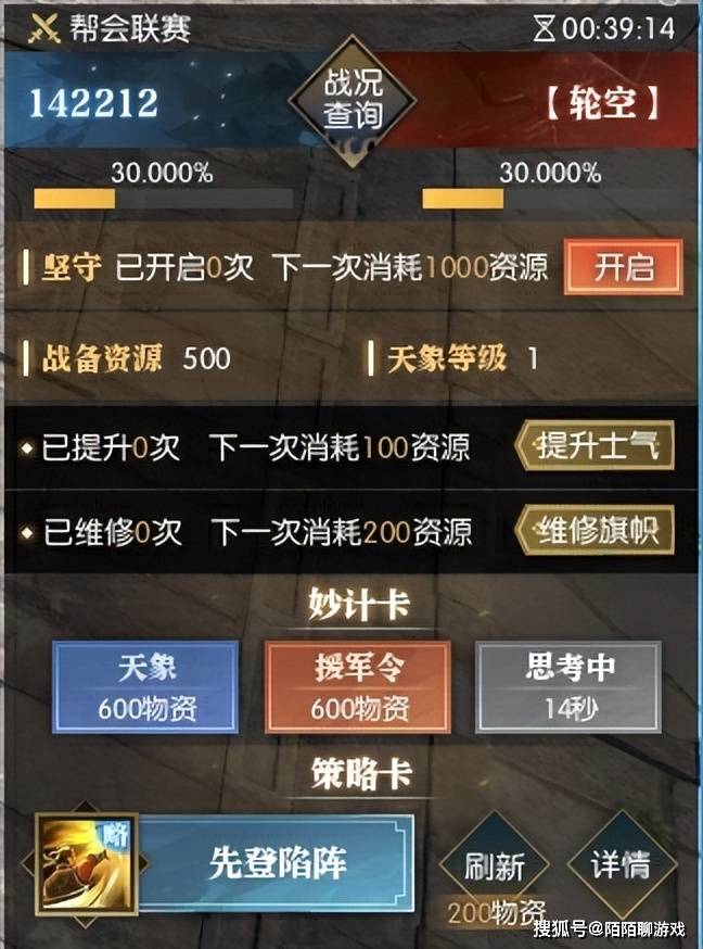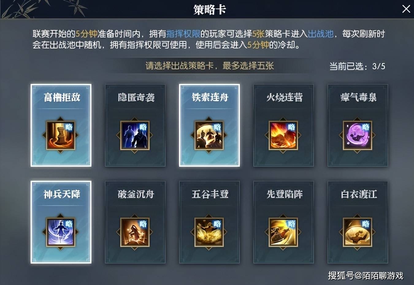 拥有技能使用权限的统战人员,在比赛进行过程中,该使用能够瞬间完成攻防转换的神兵天降、白衣渡江和隐匿奇袭;还是料敌先机,用瘴气毒泉、火烧连营等策略卡,提前布置阵地战,都会对比赛结果产生不可逆转的影响。
