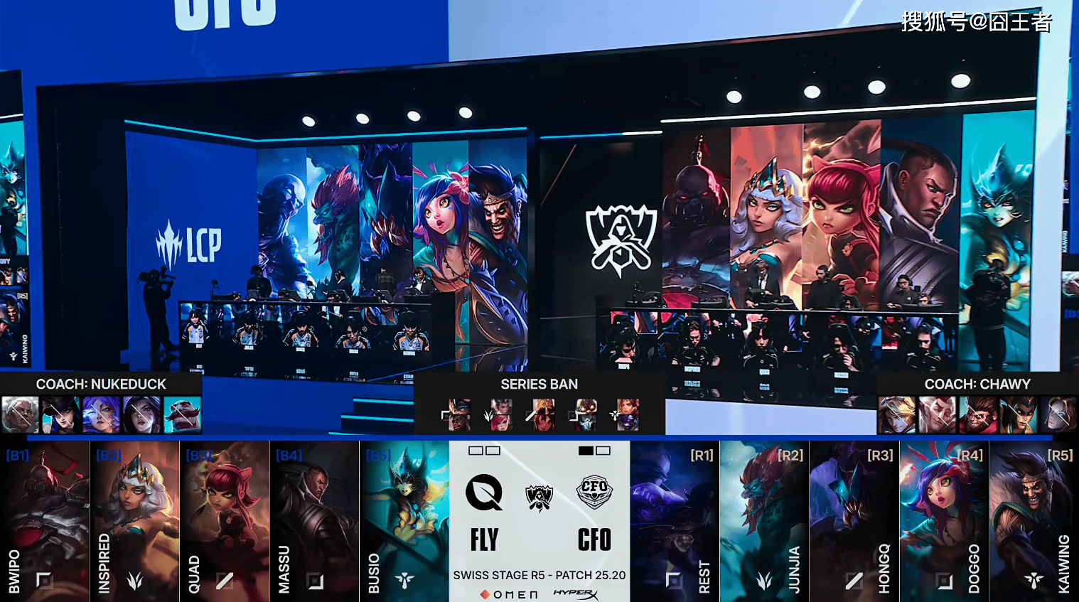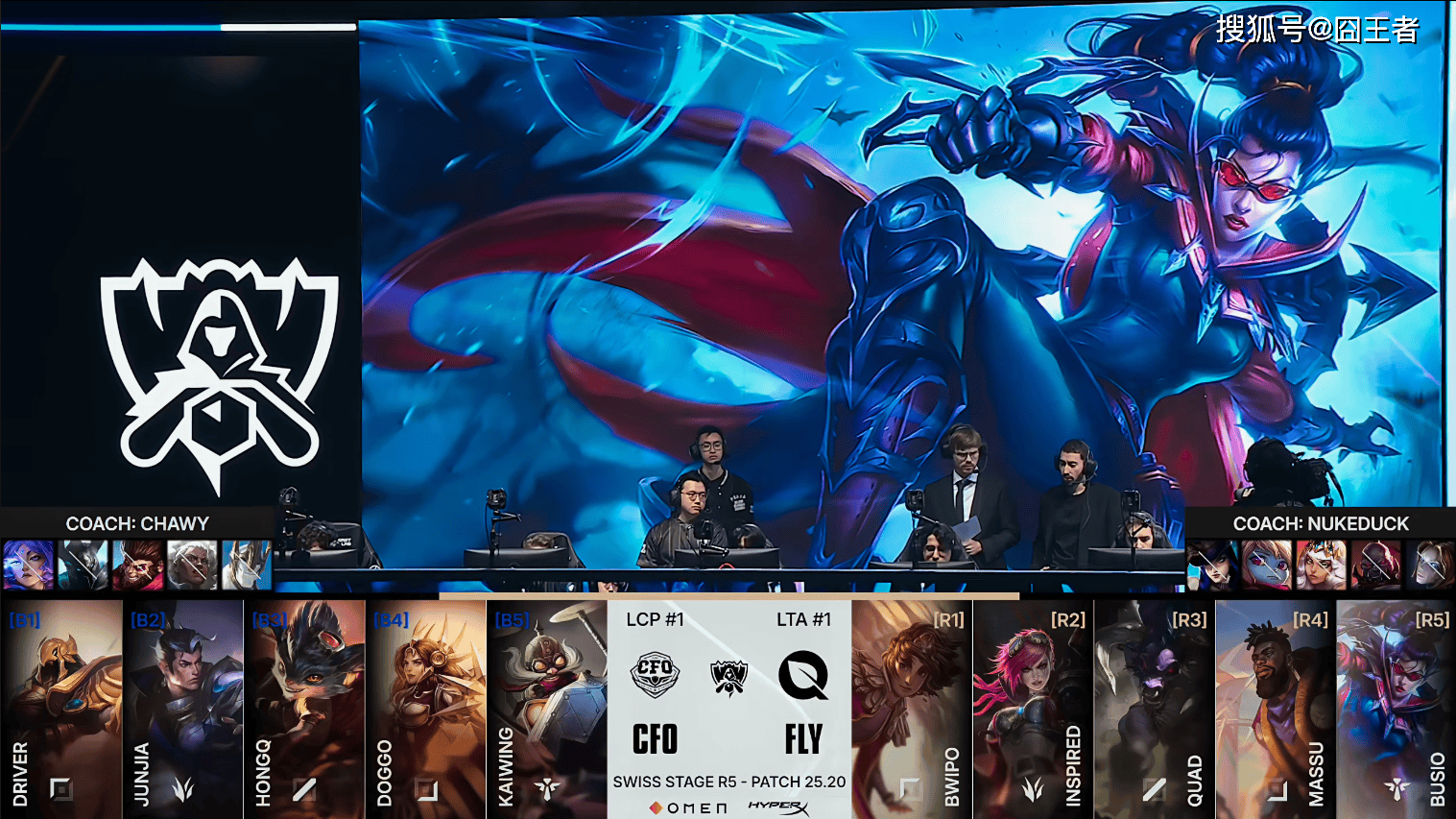 第一局比赛,CFO蓝色方,禁用:芸阿娜、铁男、猴子、安蓓萨、加里奥,选用:Driver兰博、JunJia赵信、HongQ沙皇、Doggo飞机、Kaiwing蕾欧娜;FLY红色方,禁用:奇亚娜、赛恩、发条、波比、女警,选用:Bwipo奎桑提、Inspired蔚、Quad岩雀、Massu烬、Busio阿利斯塔