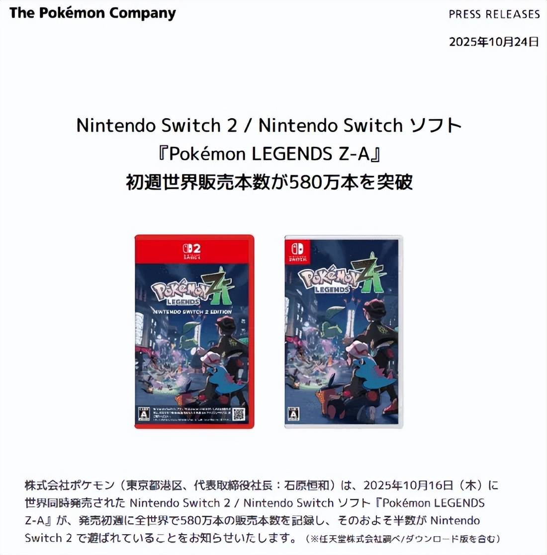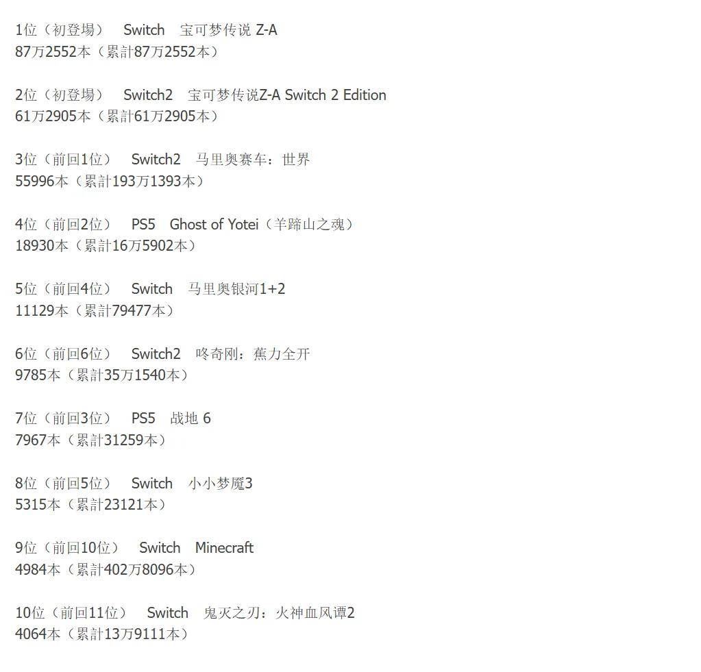 在10月13日至10月19日的新一周Fami通销量榜上,任天堂第一方大作《宝可梦传说:Z-A》横扫销量榜,双版本以140多万的销量,包揽冠亚军。