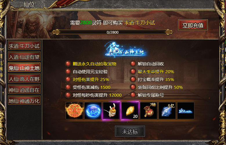 当玩家创建角色进入游戏后,可以开启仙位系统功能。玩家可以通过点击游戏界面上方的“仙位”图标,进入仙位系统界面。《白蛇传奇》游戏中的仙位系统是一个高级玩法内容,玩家需要氪到指定的灵符数量才能提升仙位等级。仙位共有6个等级,按照等级低高,依次是【求道·牛刀小试】、【入道·仙途有望】、【鬼仙·山神土地】、【人仙·高人在野】、【神仙·逍遥自在】、【地仙·神通万化】。根据玩家的仙位等级不同,玩家可以享受到不同的特权,并且还可以领取额外的丰厚礼包奖励如果玩家想要比其他玩家更快地成长,提升仙位等级是必要的。仙位系统不仅能助玩家迅速提升转生等级,还可以提供各种属性效果、便利的自动回收和自动拾取等功能,让玩家享受至尊体验