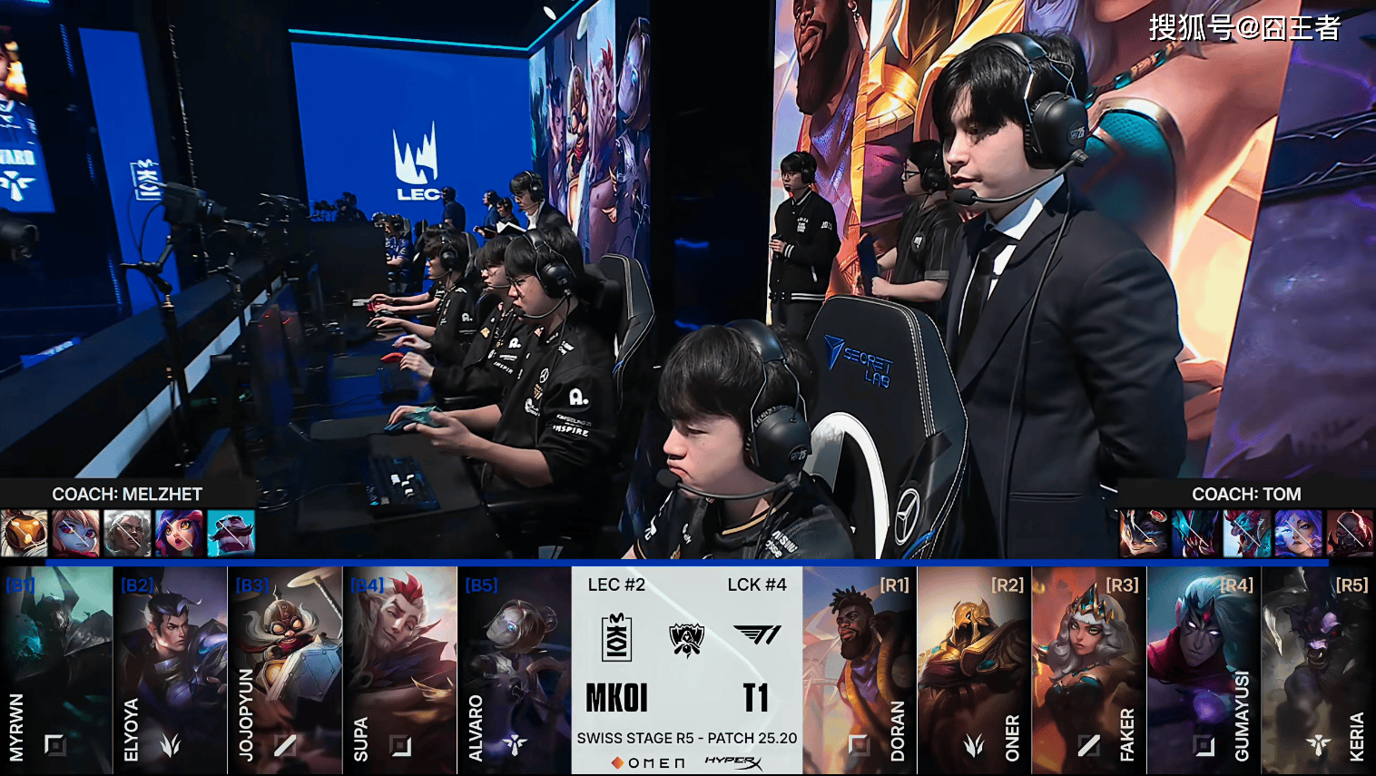 第一局比赛,MKOI蓝色方,禁用:巴德、波比、安蓓萨、妮蔻、布隆,选用:Myrwn铁男、Elyoya赵信、Jojopyun铁男、Supa飞机、Alvaro洛;T1红色方,禁用:塞恩、芸阿娜、巨魔、雷克塞、兰博,选用:Doran奎桑提、Oner奇亚娜、Faker沙皇、Gumayusi韦鲁斯、Keria牛头