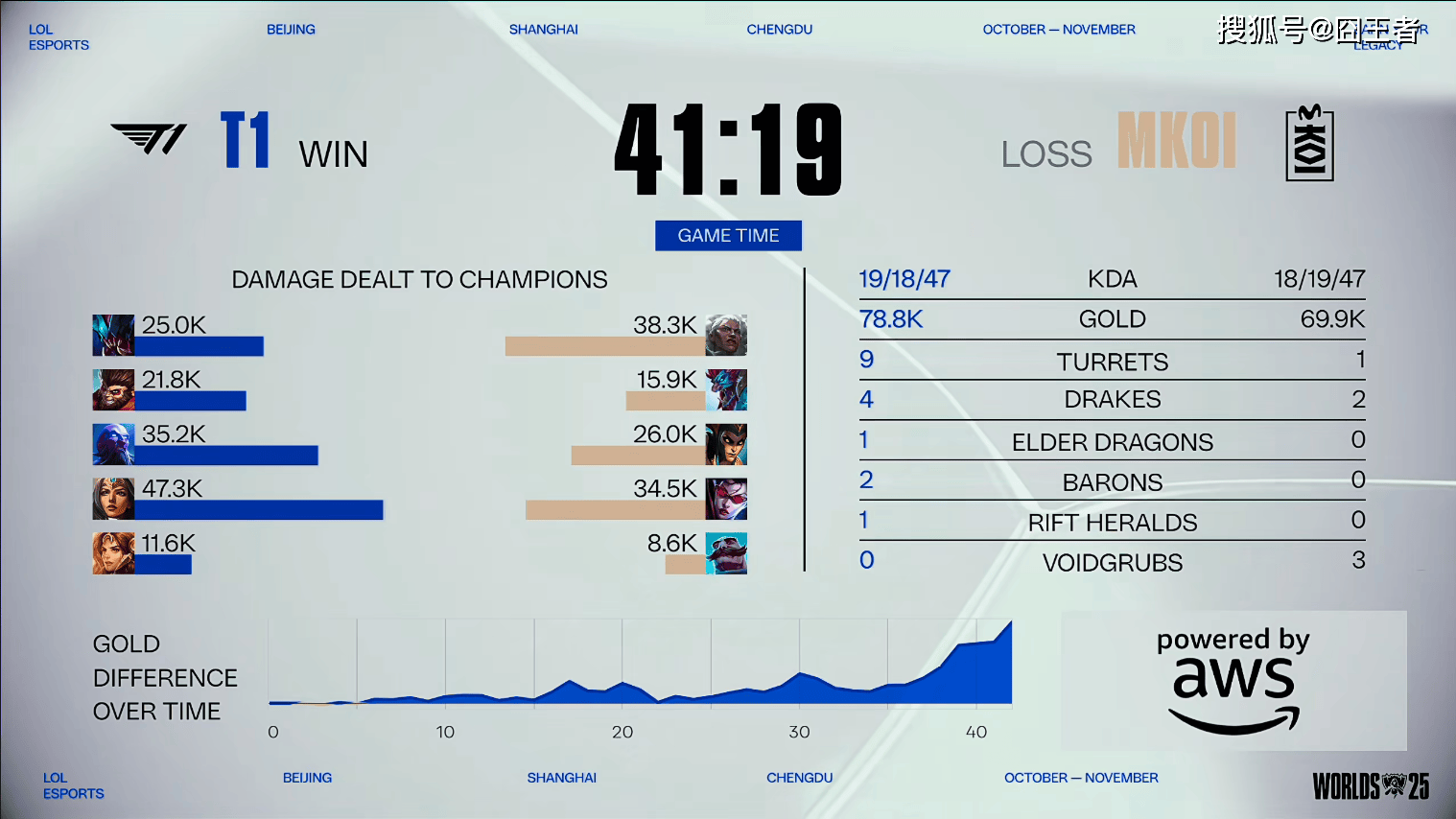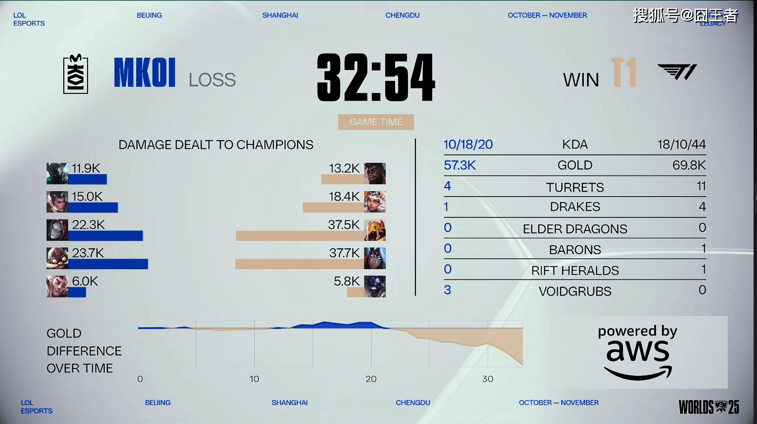 结果第一局比赛,两队各打了半场好局,所不同的是T1笑到了最后。比赛前期,MKOI连续针对T1下路得手,一度打出7-2的领先;比赛第20分钟左右,Gumayusi韦鲁斯双杀,T1打出0换2拿下厄塔汗;比赛第23分钟左右,两队在中路爆发团战,Faker沙皇三杀帮助T1打出1换4大胜,T1迅速拉开四千经济差;最终比赛第32分54秒,T1抱团一波,结束比赛,先赢一局!
