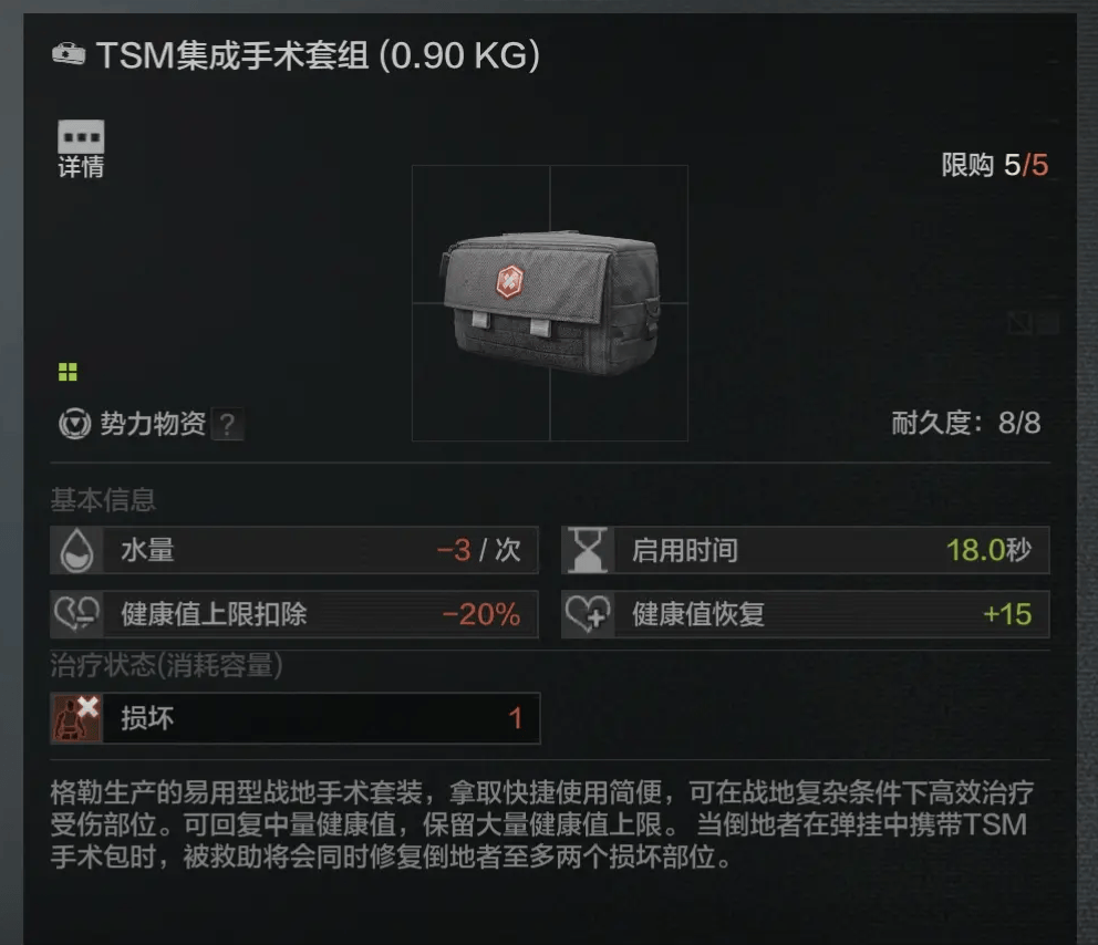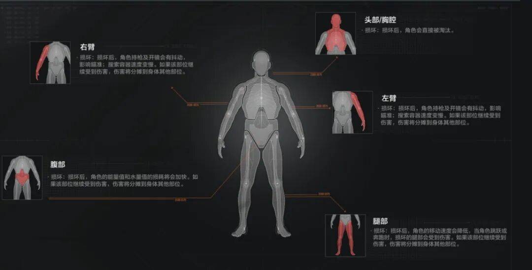 游戏的健康系统,同样师承塔科夫的多部位损伤与药品管理设计:角色的每个身体部位都有独立的血量和功能,不同的异常状态足足有十几条,受伤后不仅要止血、修复,还要应对视野模糊、体力下降等连锁反应。