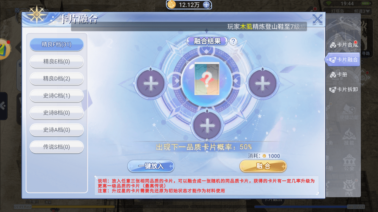 然后就是进最新区,升级打材料,卡片就是挂机打怪就会爆F级别的卡册,开启之后会随机获得F级的不同卡片,一般F级别的卡片不会有人需要,所以直接卡片融合,用三个低级的卡片有概率获得高一级的卡片,所以我们就是要合成史诗级别以上的卡片上架交易行,卡片的获取还可以通过打MVP,MVP乐园等等一些活动来获取,但是都是比较耗费时间的,所以直接挂机升级来的比较快。