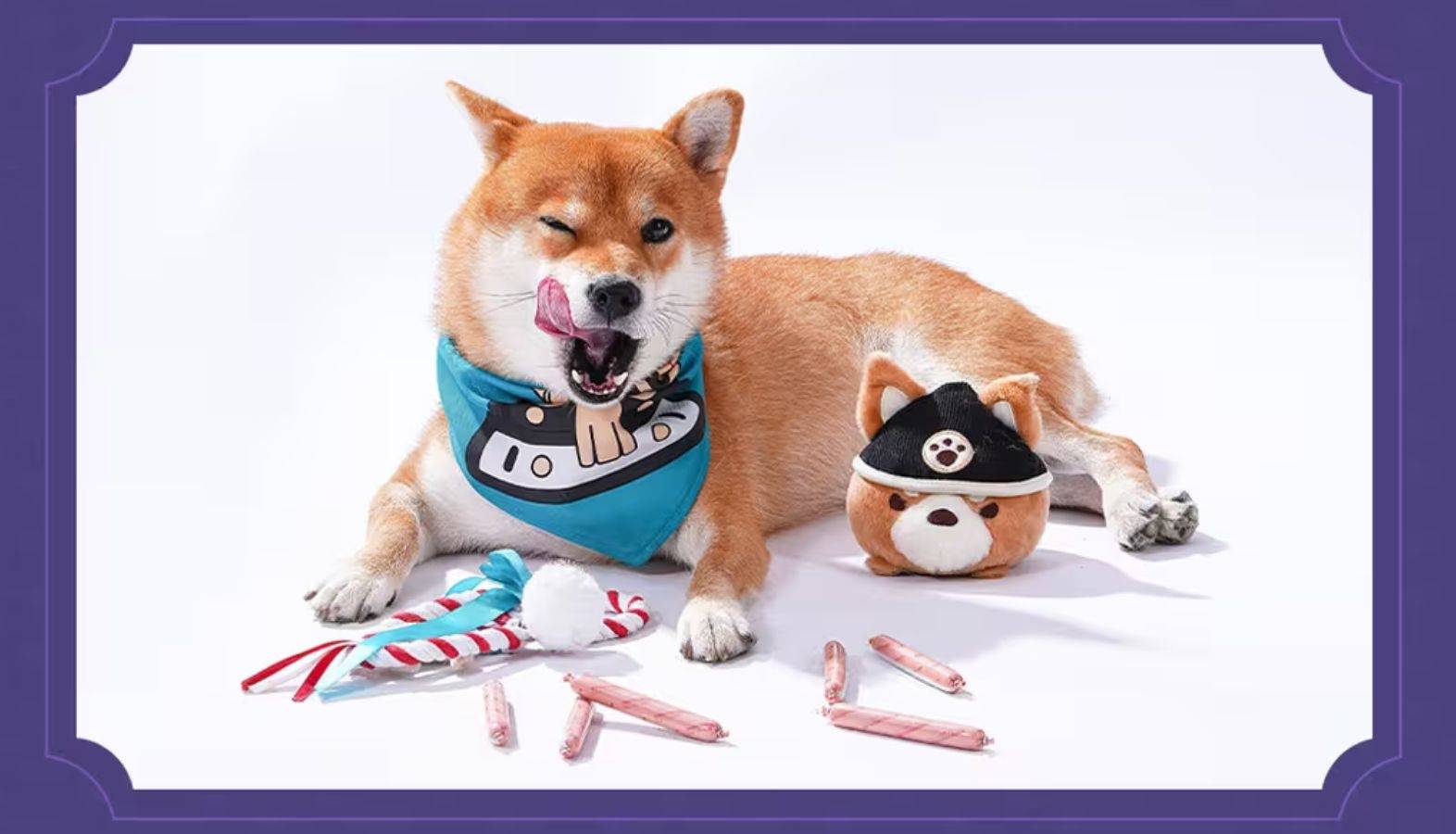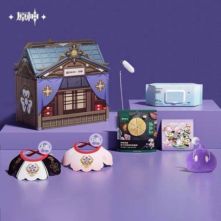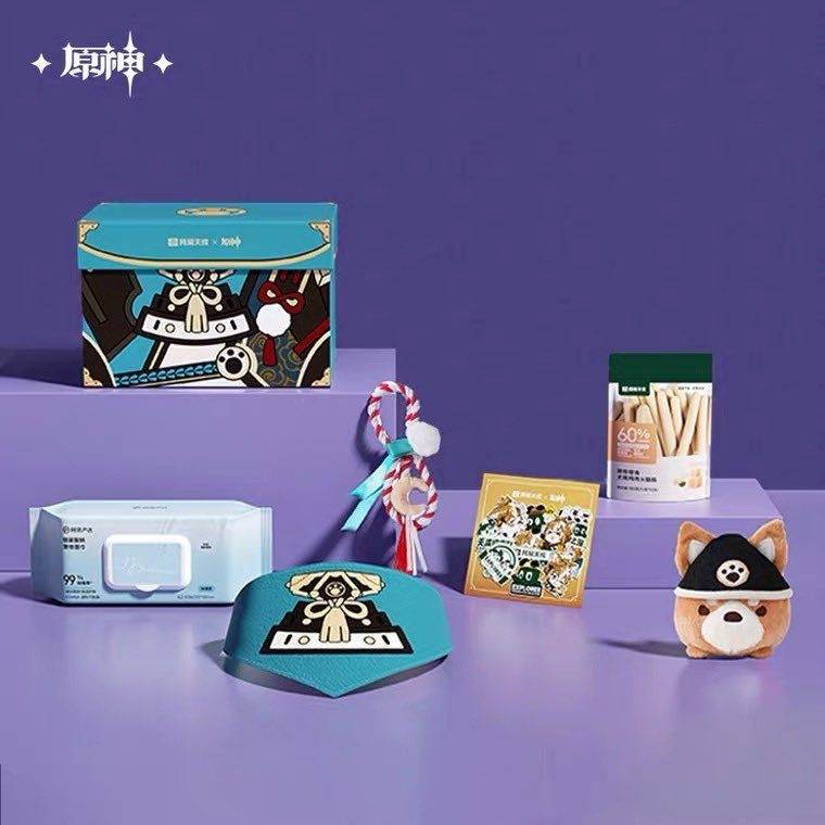 另外还有狗狗的礼盒,这个礼盒是五郎定制款,同样是萌得不行,五郎主题的围巾,戴在狗狗脖子上,有种撸狗就是撸五郎的感觉。还有《原神》主题的玩具和玩偶,完全戳中了旅行者和铲屎官的双重身份。