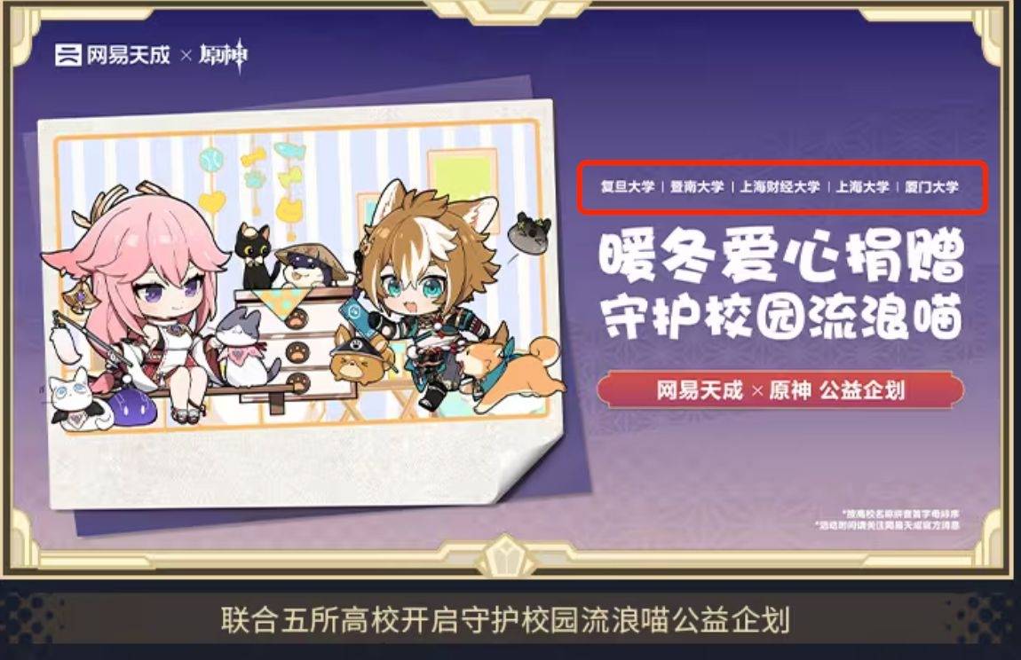除了联动对象外,《原神》这次的公益事业首先将目光放在了五所高校上,分别是复旦大学、暨南大学、上海财经大学、上海大学、厦门大学,将联合这五所高校的猫协,开启守护校园流浪喵企划,为校园里的流浪猫捐赠物资。