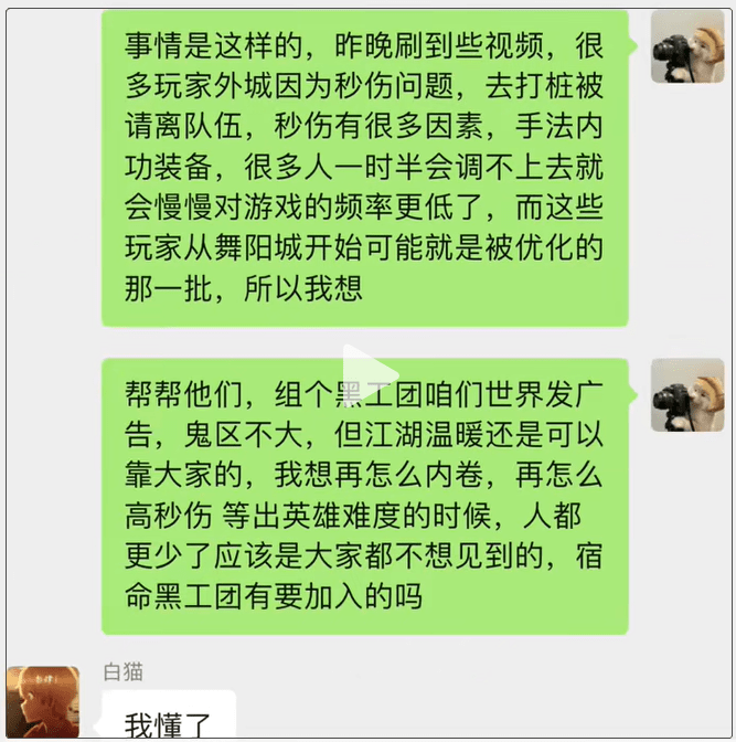 在宿命相逢服务器,“黑工团”迅速发展成为了300多人的团队,并且影响到《逆水寒》手游其他服务器,也自发组织“黑工团”帮人打本。