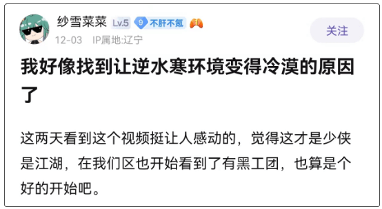 看到这里,相信你也了解了:所谓《逆水寒》手游的“黑工团”,是自发向新人伸出援手,帮助别人的人,只能说这届年轻人有主见、乐于助人,根本没啥好害臊的。