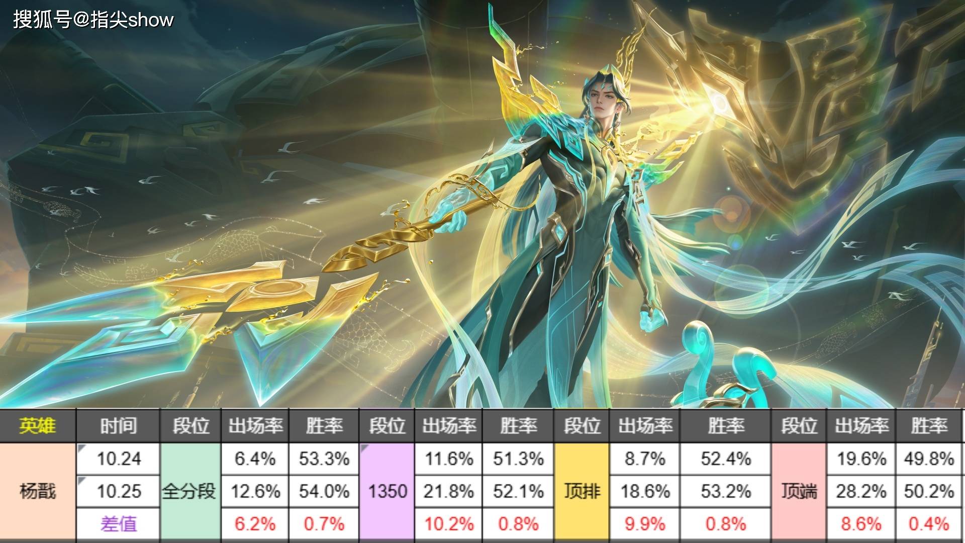 因为杨戬的版本梯度高,且一直比较火热,因此他的涨幅也相当夸张,全分段6.2%,巅峰赛涨幅超过了10%。