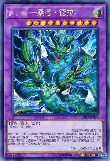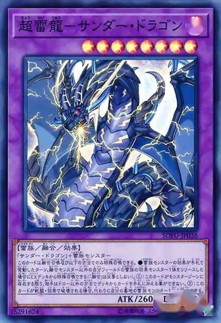 「雷龙」+雷族怪兽 这张卡用融合召唤以及以下方法才能特殊召唤。 ●雷族怪兽的效果在手卡发动的回合,把融合怪兽以外的自己场上1只雷族效果怪兽解放的场合可以从额外卡组特殊召唤(不需要「融合」)。 ①:只要这张卡在怪兽区域存在,对方不能用抽卡以外的方法从卡组把卡加入手卡。 ②:这张卡被战斗·效果破坏的场合,可以作为代替把自己墓地1只雷族怪兽除外。 |