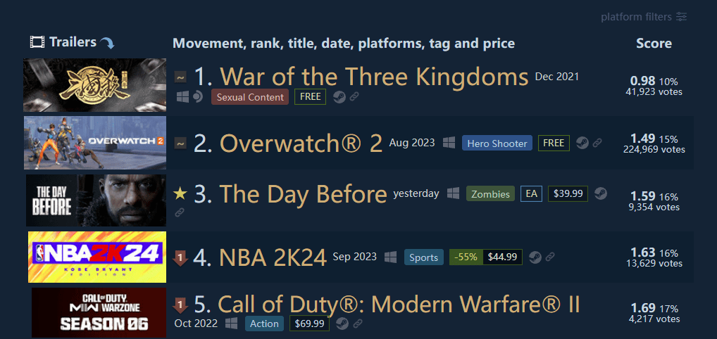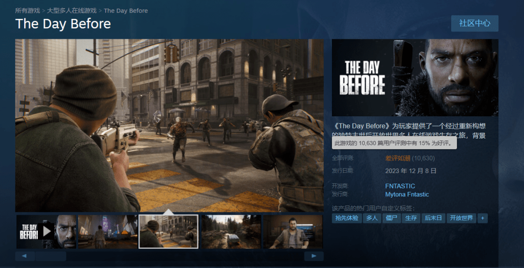 曾备玩家受期待的开放世界多人生存游戏《浩劫前夕(The Day Before)》最近正式在Steam开启了抢先体验,本作曾是Steam愿望单排行榜第一,但发售后被却玩家称为“究极粪作”,据Steam 250显示 《浩劫前夕》现已成为Steam差评榜第三,仅次于《守望先锋2》超过了《NBA 2K24》,谁也没有料到2023年底还会有这样一个“高手”。