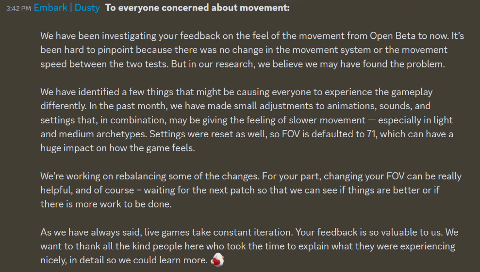 Embark在Discord服务器上发布帖子称:“我们已经发现了一些可能导致每个人体验到不同游戏玩法的原因。在过去的一个月里,我们对动画、声音和设置进行了小幅调整,这些调整综合起来可能会让人感觉移动速度变慢--尤其是在轻型和中型角色中。”团队表示目前正在 “努力重新平衡一些变化”。然而,这还不是全部。