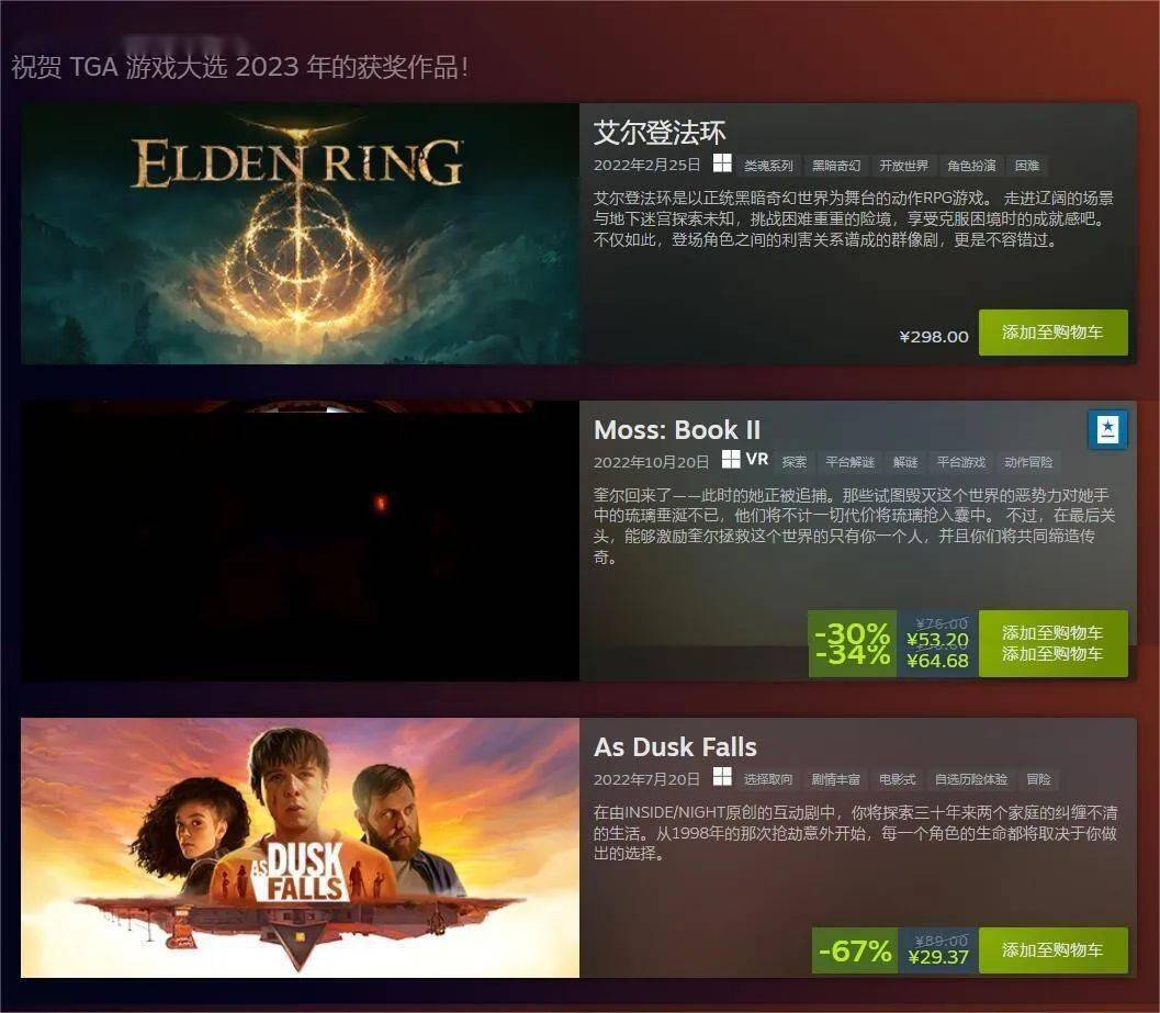 Steam历年TGA获奖游戏大促开启:《2077》等均史低
