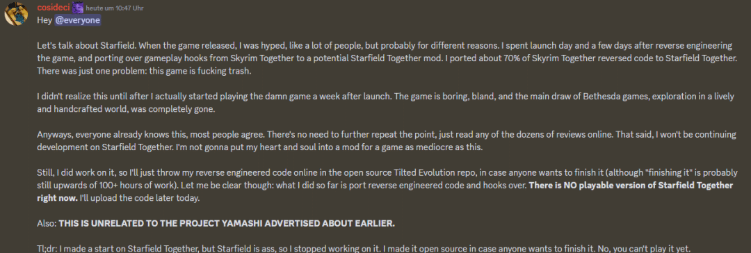 他写道,其实Mod移植工作已经完成了70%,但因一个原因导致无法再继续下去,那就是——“这款游戏就是TM垃圾”。随后,Cosideci严厉批评了《星空》的游戏质量,并对缺乏沉浸式探索感到失望,他认为这本是B社游戏过去获得成功的重要因素。
