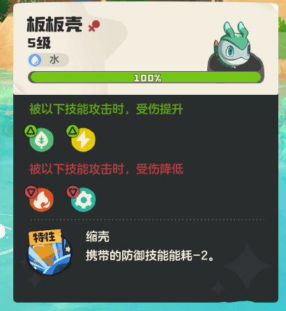 而且在进战斗之后,它们依旧是缩在壳里的状态,只有受到攻击一次才会从壳里钻出来。这个精灵的特性是可以让携带的防御技能能耗减2,这个特性和小王八外形真的是非常契合啊哈哈哈。