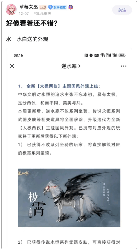 12月7日的《逆水寒》周更后,连6块钱都不要了,官方居然白送外观,而且还是超高品质的那种。