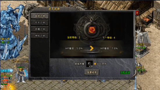 其他高级地图的爆率也很高,不过比较重要的点在冰雪之城,中期的时候进高级地图刷刷怪,打打boss升级官职还有逆天改命,血龙和先天之体的丹珠可以通过打怪掉落获得,恶魔和神佑护体是需要购买的,两个都升满大概在3k-4k左右