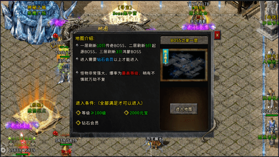 有红魔套和最低史诗级武器之后可以去boss集中营打boss,一共三层,一层有十只boss,二层有五只,三层有三只,不过里面的boss是定时刷新,会有大批玩家抢boss,建议团长带玩家一起进图,否则不是极品装备很容易被打到自动回城