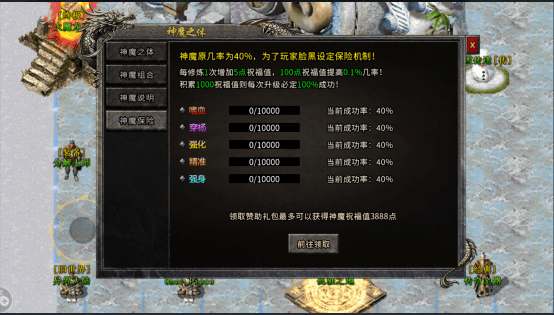 高级地图前期建议不要去(天地之域,海外仙岛,世外桃源,冰雪之城)里面的怪比较难打,攻击力高,血厚,建议6转左右200级左右这时候基本上有不错的装备,冰雪之城可以进,买完最强王者和君临天下之后可以进冰雪之城点大神魔,后两个赞助有神魔保险点(就是增加的祝福,最强王者888,君临天下2888),每点一次增加5祝福,每100点祝福成功率增加0.1%,累计10000祝福值百分百成功,可直接点满,每个神魔的祝福的独立的,在神魔保险可以查看当前祝福值,这是一个大消费点,也是进后期爆率地图的必须条件,点满神魔运气好点大概1w多点,运气不好的可能2-3w左右