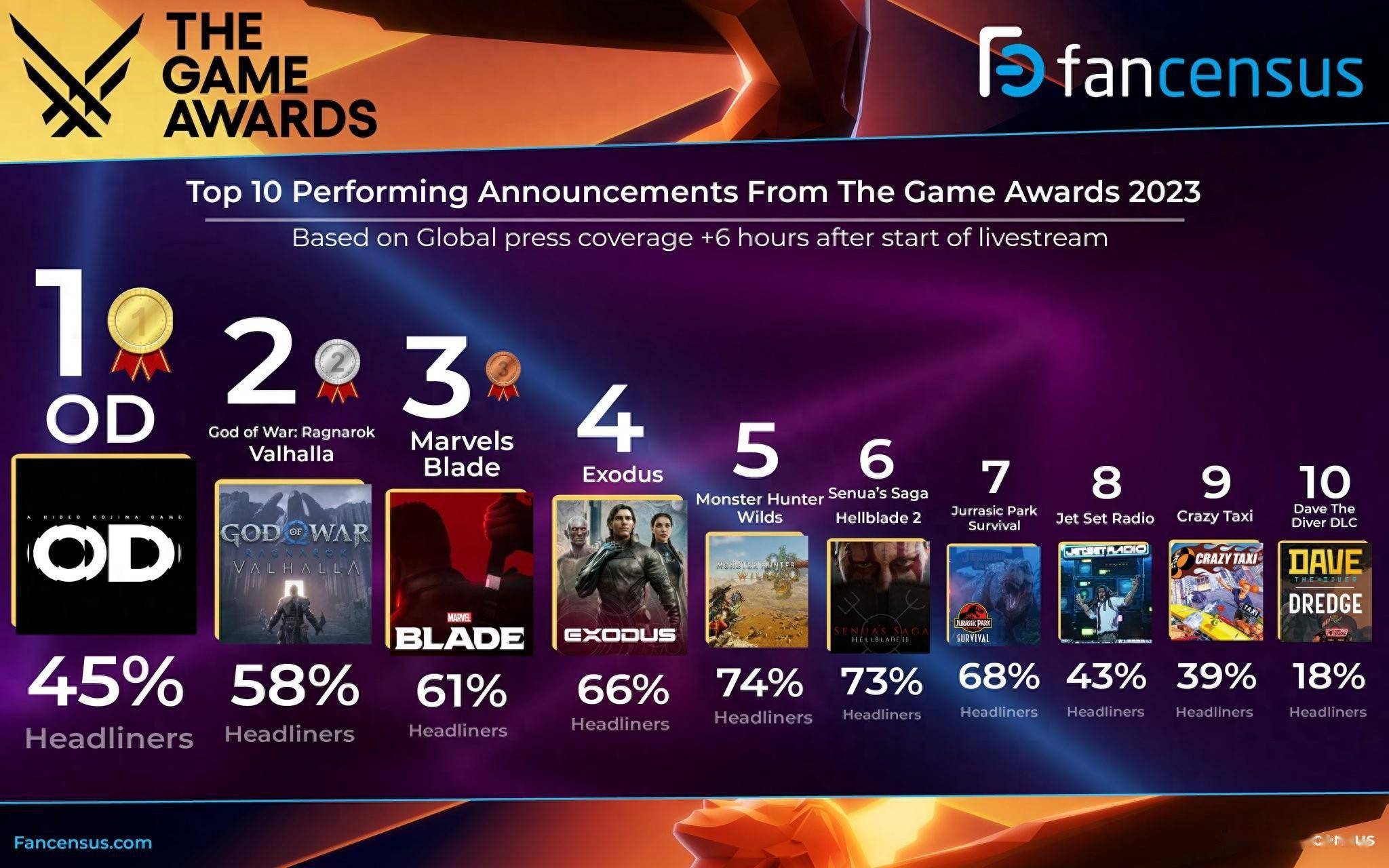 据统计机构Fancensus统计的数据显示,小岛秀夫新作《OD》是TGA上最受媒体青睐(全球媒体新闻报道数量)的游戏,而《战神5》DLC紧随其后,《怪物猎人:荒野》第五。