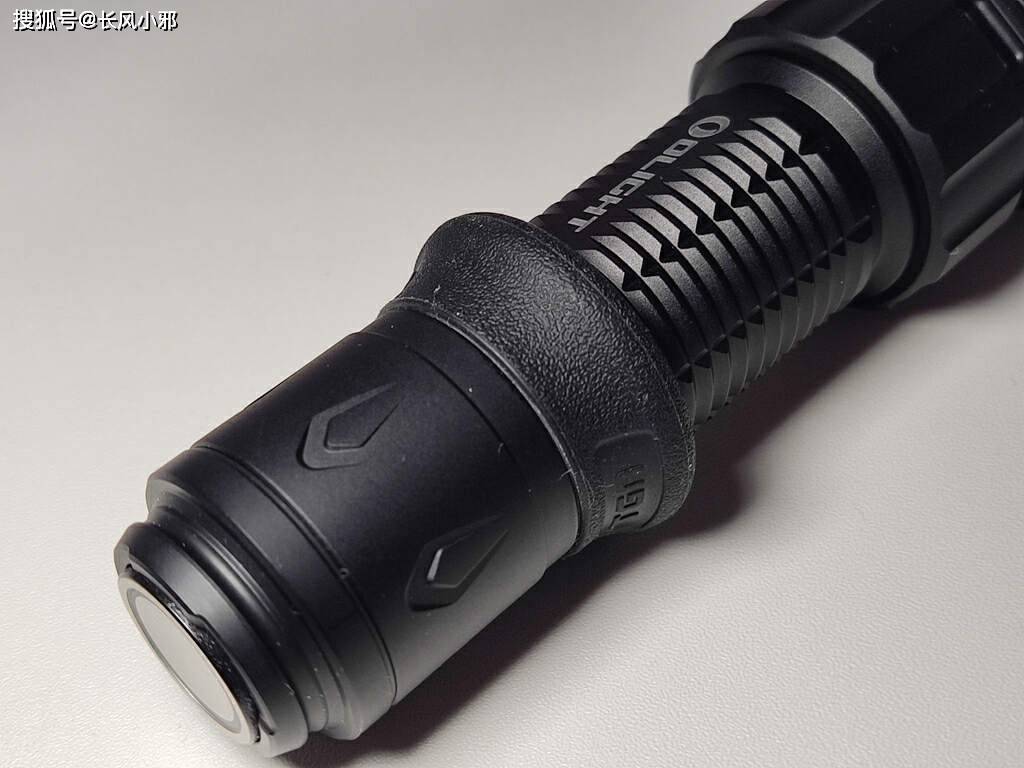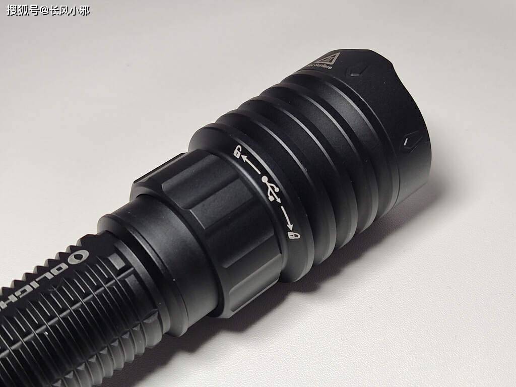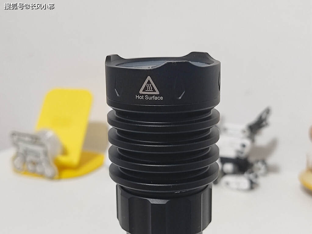 灯头上的攻击头为坚硬的不锈钢材质,侧面标注了表面高温提醒,使用时请勿触摸。头部四周设有四圈散热结构,在手电工作时候可以大大降低灯珠发出的热量,延长灯珠的使用寿命。