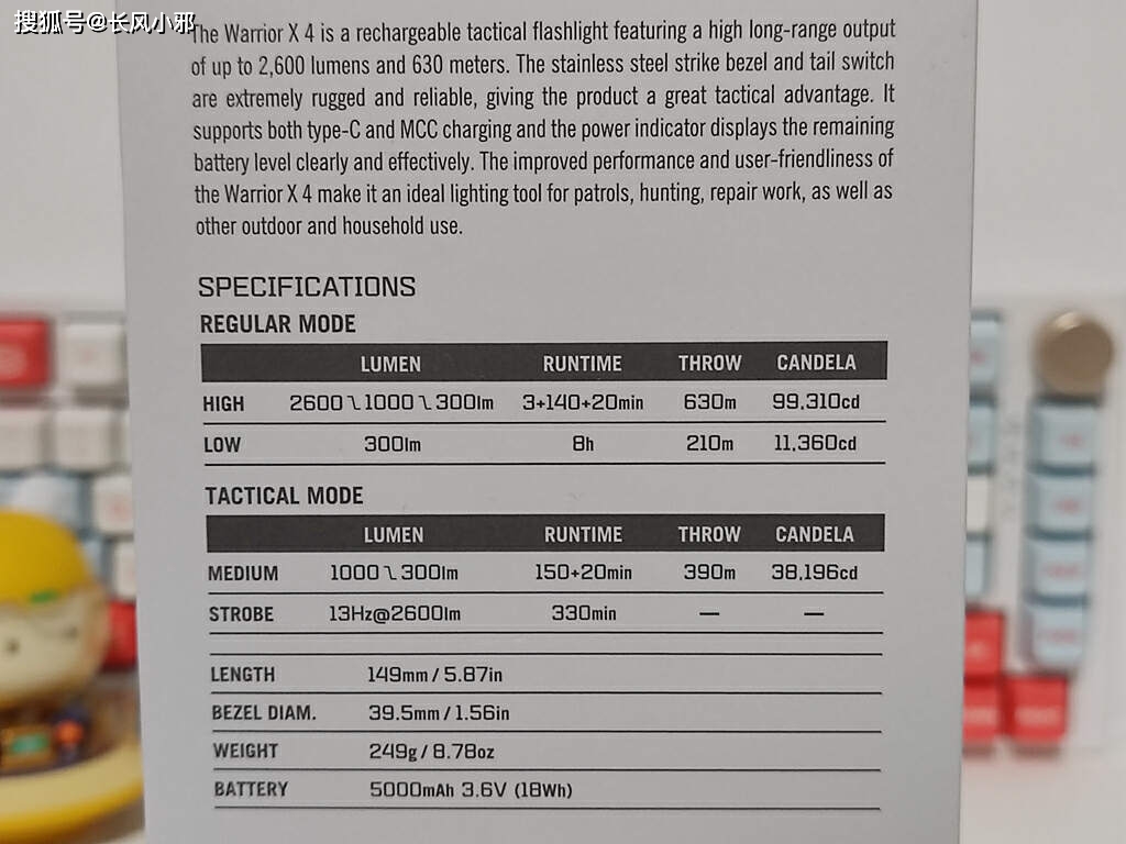 背面标注了武士X4详细参数,本次X4新增了战术加强模式(多了中档和爆闪档位),更加实用。满电情况下,常规模式:高亮档手电输出最大亮度2600流明、射程630米下,续航3分钟降到1000流明续航140分钟,再次降到300流明续航20分钟;低亮档手电亮度固定输出300流明,射程210米,续航长达8小时。战术加强模式:中亮档手电输出1000流明、射程390米下,续航150分钟降到300流明续航20分钟;爆闪档手电持续输出13Hz2600流明,续航330分钟。