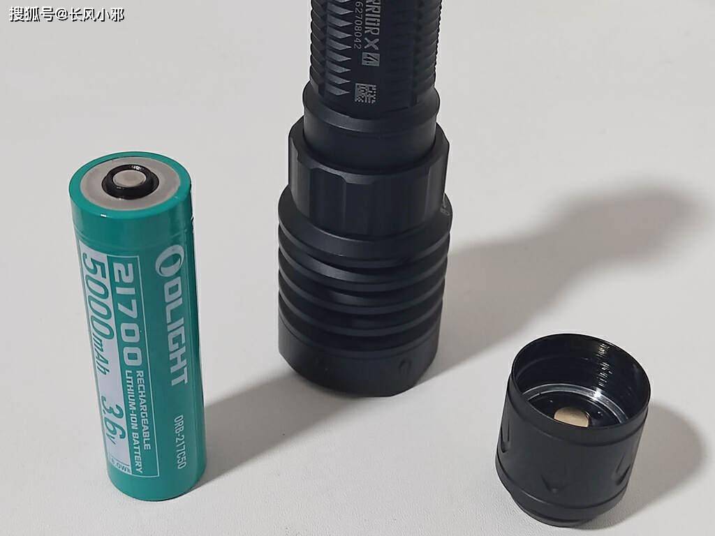 取下武士X4的尾盖,内置1节蓝皮容量为5000mAh的21700锂电池,这节电池为傲雷专属定制的高性能电池,只能用于本品牌的手电;