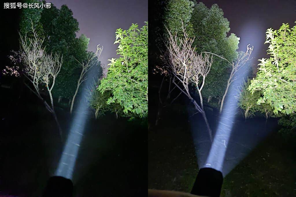左边开启低亮度,右边开启高亮度。可见,无论高、低亮度,武士X4的远射能力都很突出,而且还有泛光效果,兼顾的近处的照射,这点也要比普通战术手电要好很多,常规战术手电的远射能力在低亮度时会大打折扣,而武士X4在低亮度下仍旧可以保持210米的远射能力,性能很强劲;