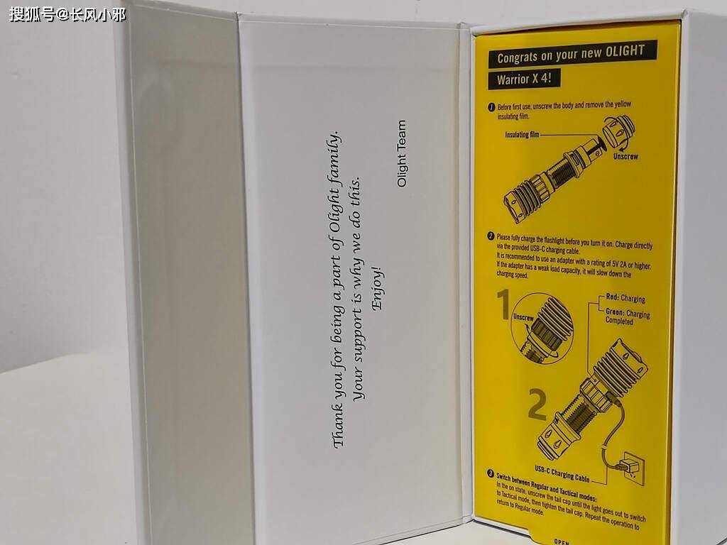磁吸式开盖设计非常有仪式感,内部金黄的标签非常醒目,其上印有快速使用和充电指南,