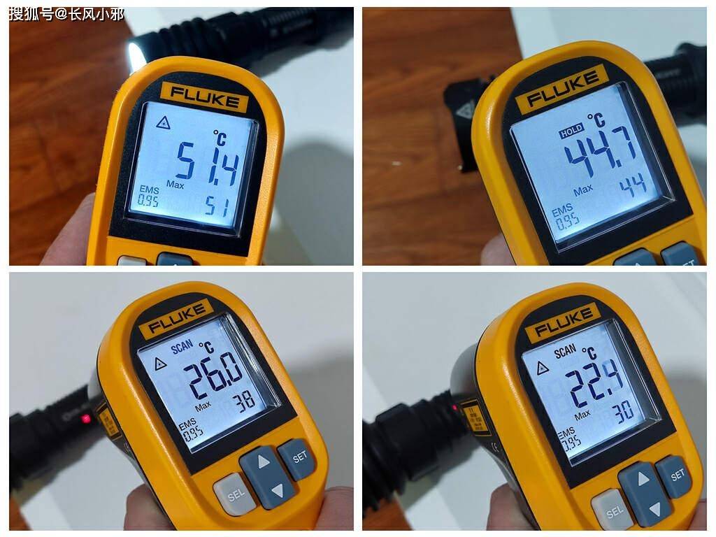 回家后,我瞄了下房间内温度计只有18℃,于是我把手电开到高亮档,5分钟温暖从X4传到了我的手心。这时我用福禄克59C测了下武士X4灯头表面最高温度为51.4℃;灯头四周散热结构的表面温度为44.7℃;握把表面温度为26℃,尾部表面温度为22.4℃。