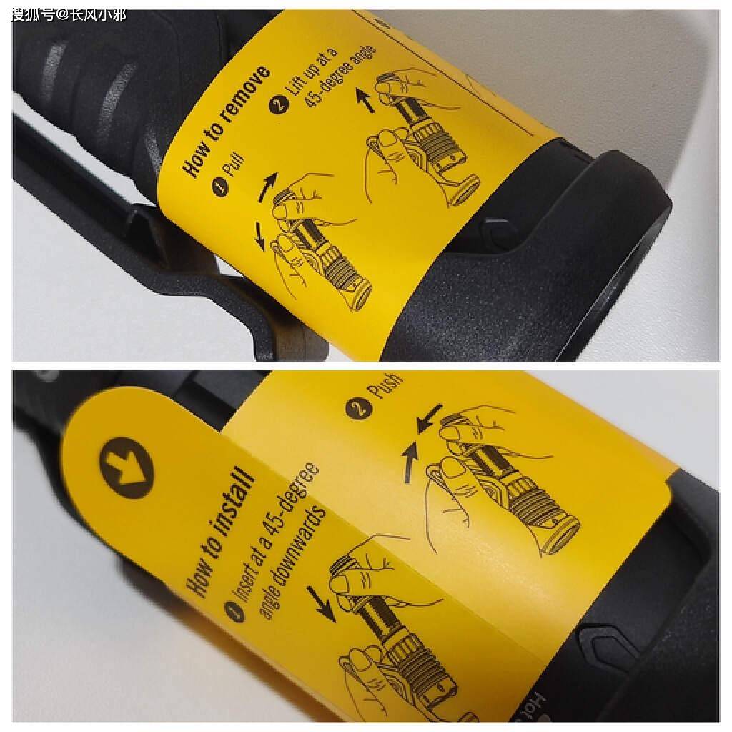 撕开快拔套上的贴纸前,可以先查看快拔套的使用说明。无论是取出还是装入手电,按45度角最为合适;