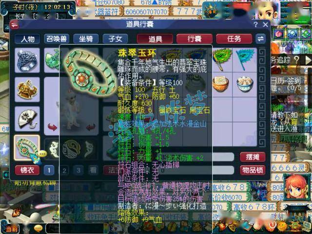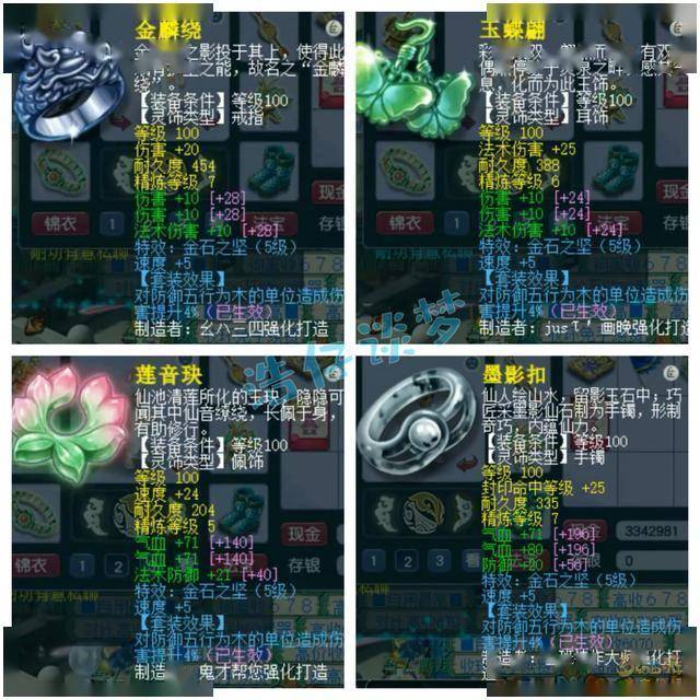 戒指和耳饰下排都是双伤害一法伤,配饰下排双气血一法防,手镯下排双气血一防御,特效都是5级金石之坚。