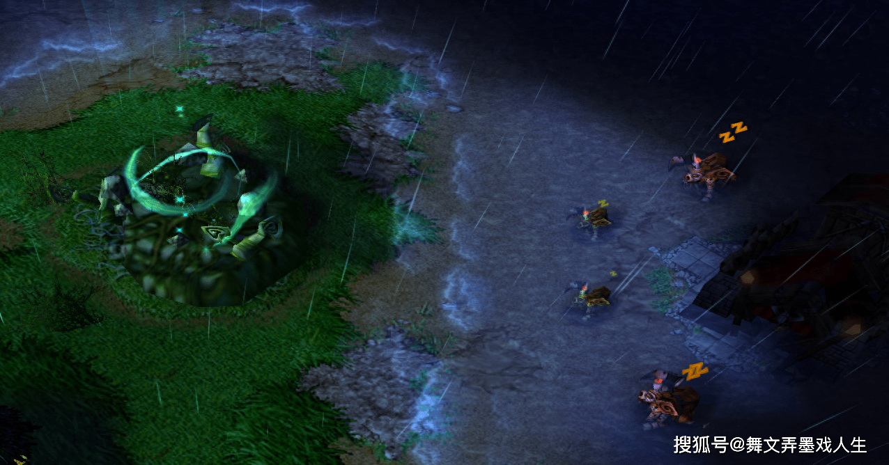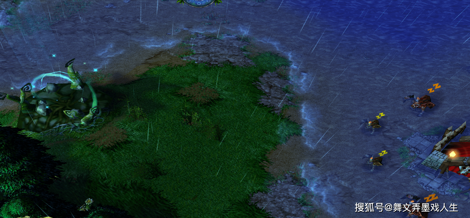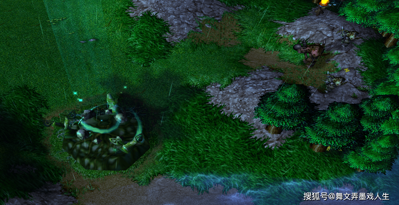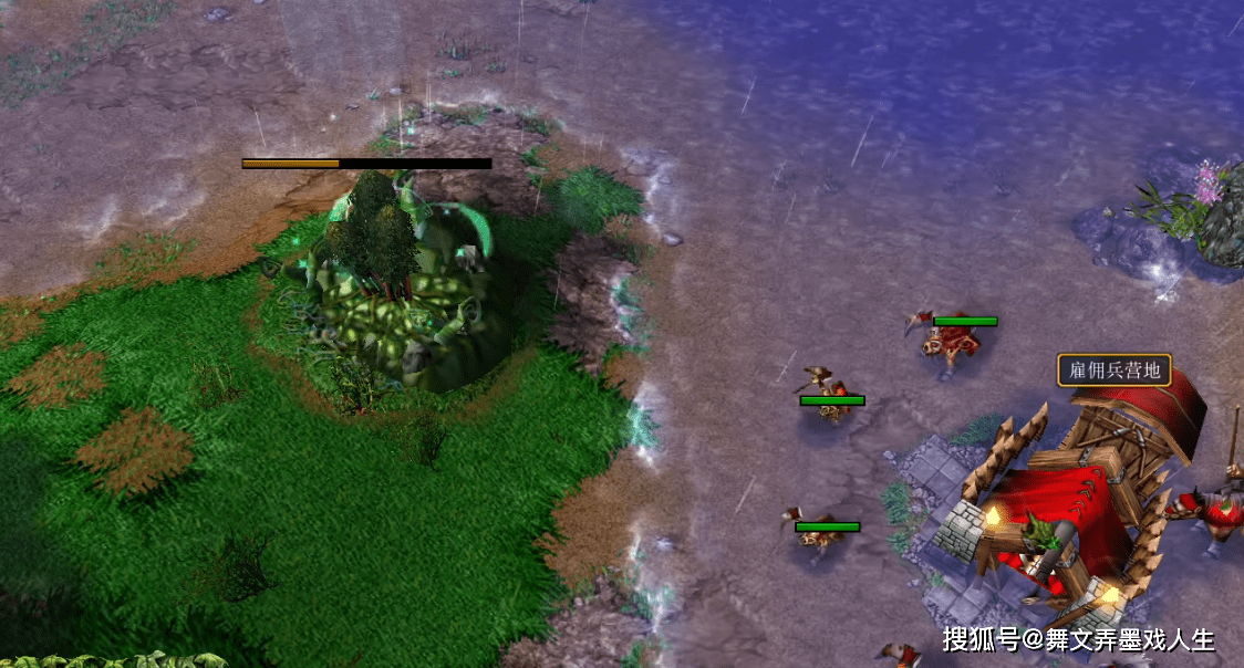 由于回音岛右边的雇佣兵营地门口就有一块可以摆放建筑的平地,暗夜精灵想要快速清理这个点位时,完全可以直接在这个位置摆放战争古树。