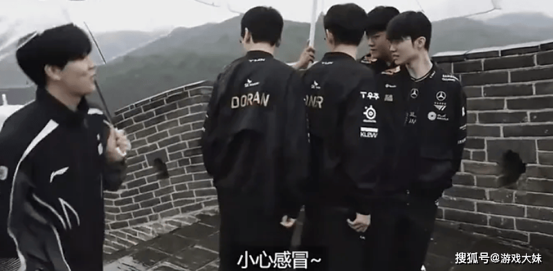 当天北京的天气并不理想,细雨笼罩着长城的石阶,风也带着几分寒意,两支队伍并未提前约好,彼此在长城相遇时都略显惊讶,iG的队员正准备下山,而T1则刚好上到拍摄点,就在双方擦肩而过的那一刻,镜头记录下了一个温暖的瞬间——TheShy笑着提醒T1的选手们:“下雨天,小心感冒。”