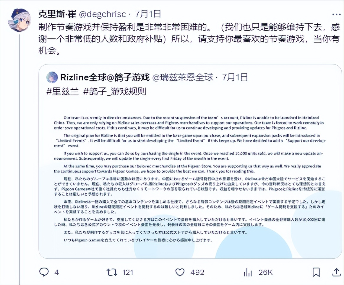 “鸽游”在这条状态表示,目前工作室处境十分艰难,仅能依靠《Rizline》的海外收入和《Pighros》 支持运营,为节省运营成本目前团队远程办公,这种情况持续下去,他们可能很难继续开发和提供 《Phigros》 和《 Rizline》 的更新。