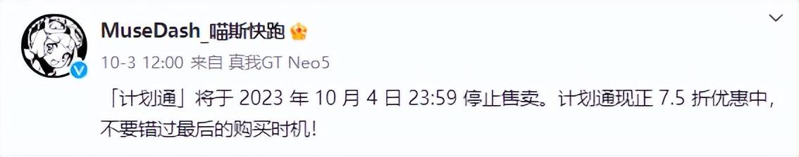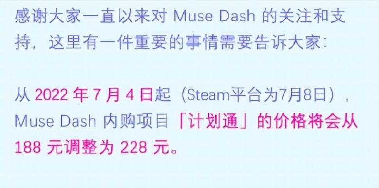 音游《Muse Dash》也是一个例子。它曾推出188元的“计划通”模式,即玩家可一次性获得所有付费曲包、角色等,并将永久享有后续更新的所有付费内容。而《Muse Dash》继去年“计划通”涨价后,今年九月,又宣布将在联动中推出新的“曲包”付费模式,虽然对计划通玩家有折扣,但也推翻了“计划通”计划,引起玩家的不满,最终改为今年10 月 4 日停止售卖“计划通”。