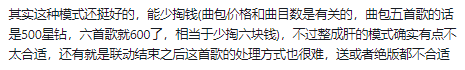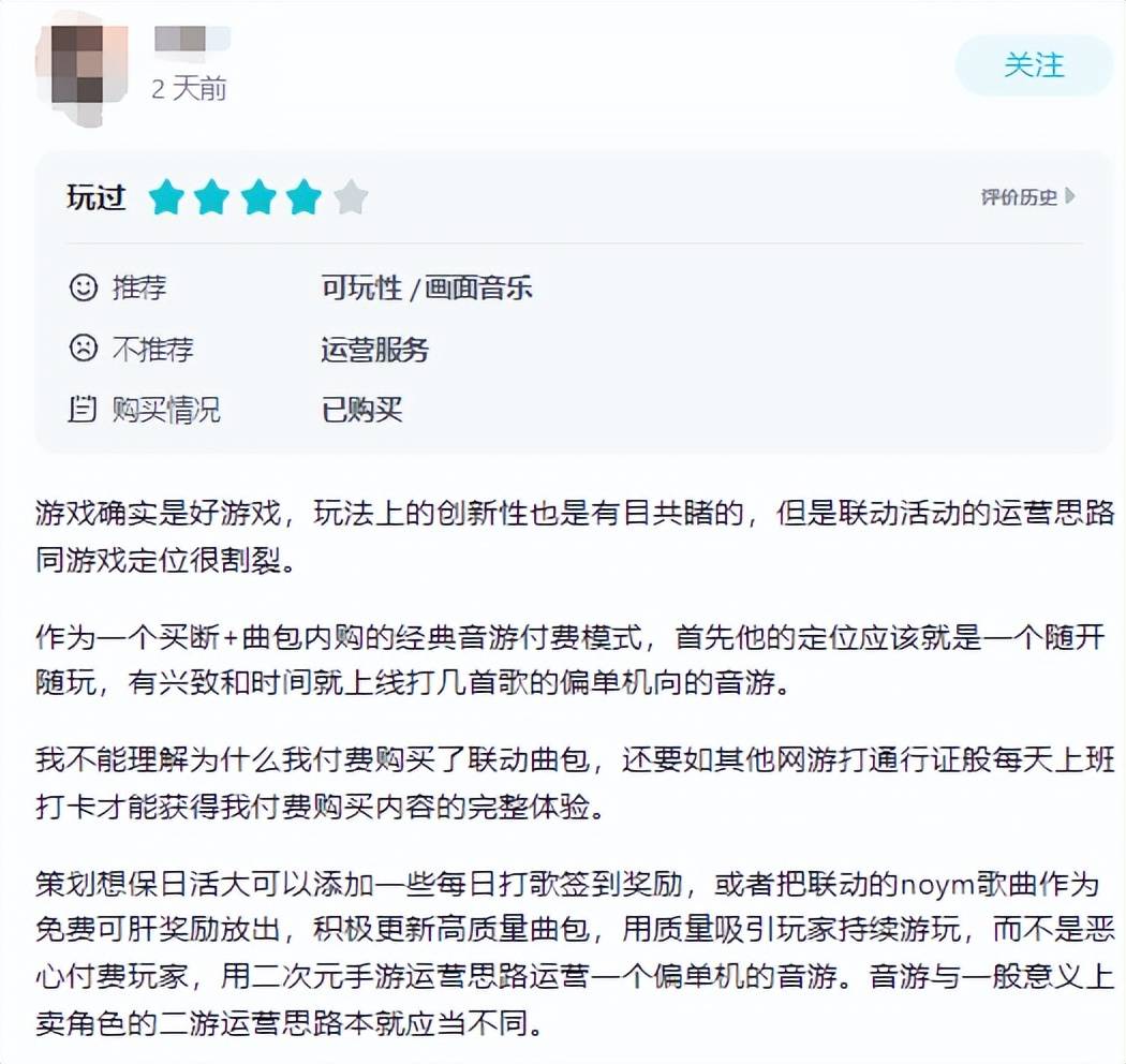 不过关于这点,有玩家评论:联动活动的运营思路似乎同游戏定位有割裂感。作为单机游戏,玩家更想佛系游玩,而如“上班打卡”式的联动才能兑换额外歌曲和角色,违背了单机游戏的体验感。也有音游玩家表示能够理解,但如果一段时间不打,相关活动免费歌曲需要等待复刻,这或许让他难以接受。