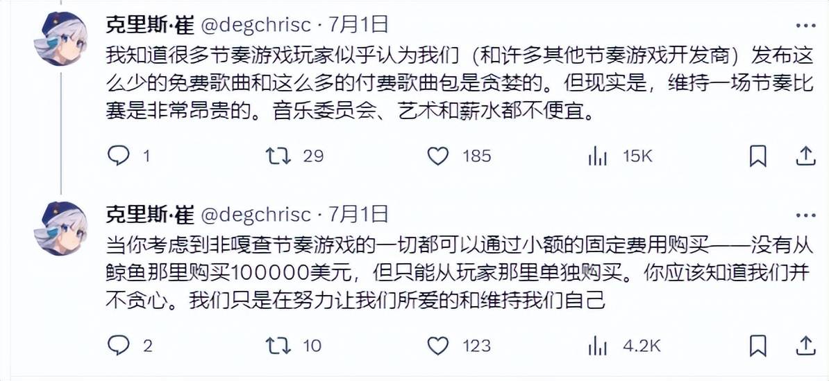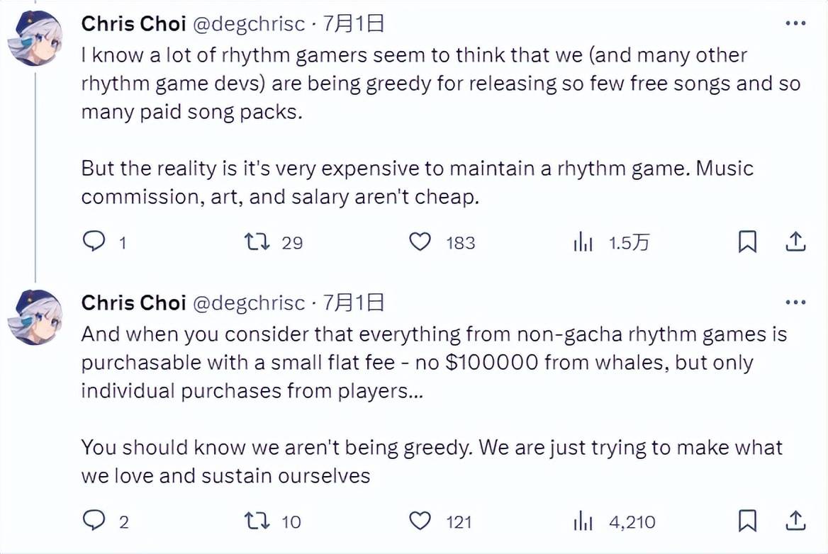 《旋转音律》的发行负责人小星也向茶馆表示,2022年《Project SEKAI》在日服游戏下载榜为第1名,但付费榜仅为排名第12。而Chris今年7月也在社交平台转发《Phigros》开发商鸽游的状态,表示制作音游保持盈利是件非常困难的事。
